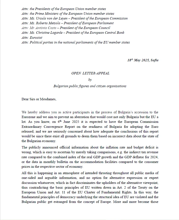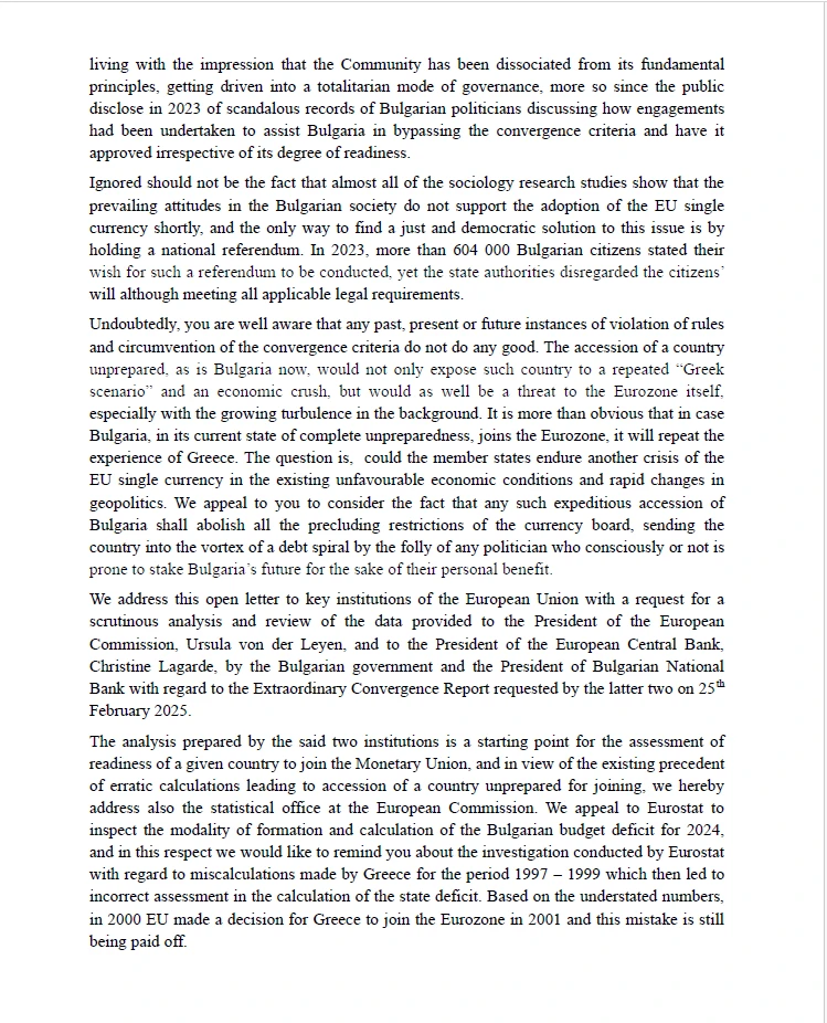 Адресираме настоящото писмо до ключовите институции в Европейския съюз с молба за критичен анализ и преглеждане на предоставените от българското правителство и БНБ данни до председателя на Европейската комисия, Урсула фон дер Лайен, и до президента на Европейската централна банка, Кристин Лагард, във връзка с поискания на 25 февруари 2025 г. от страна на българското правителство и управителя на БНБ извънреден конвергентен доклад.