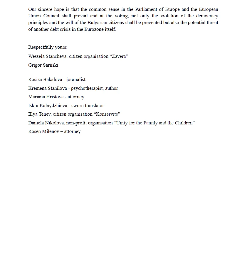 Искрено се надяваме, че здравомислието в Парламента на Европа и Съвета на Европейския съюз ще надделее и при гласуването ще се спре не само потъпкването на демократичните принципи и волята на българските граждани, но и потенциалната заплаха от нова дългова криза в самата еврозона.
